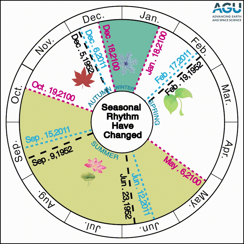 研究チームは、調査の結果を基に、気候変動が現状のまま進行した場合の2100年の四季の期間を予測。