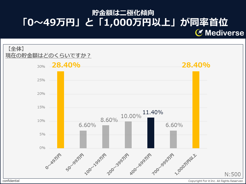 貯金額は「0~49万円」と「1,000万円以上」が同率1位