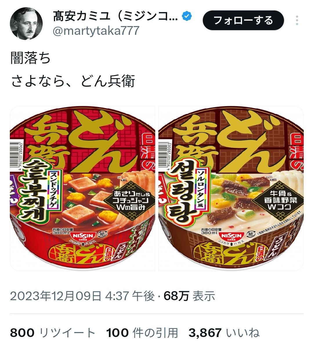 96 :名無しさん@涙目です。:2023/12/09(土) 22:42:02.56 ID:kXwPSfUO0.netカップヌードルのCMとか見ても完全に日清狂ってるやん